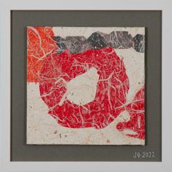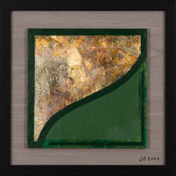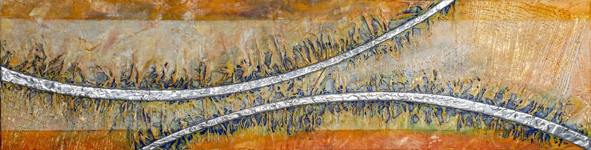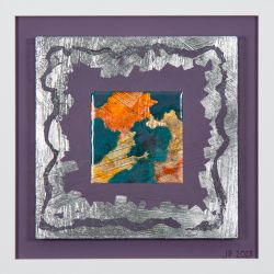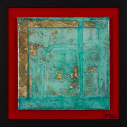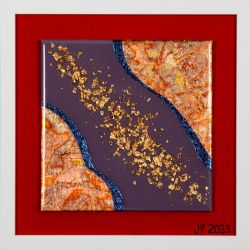 Verwendete Materialien sind: Acrylfarbe, Alkoholtinte, Epoxydharz, hauchdünne, diverse Blattmetalle, Oxydationsmittel und handgeschöpftes Papier.