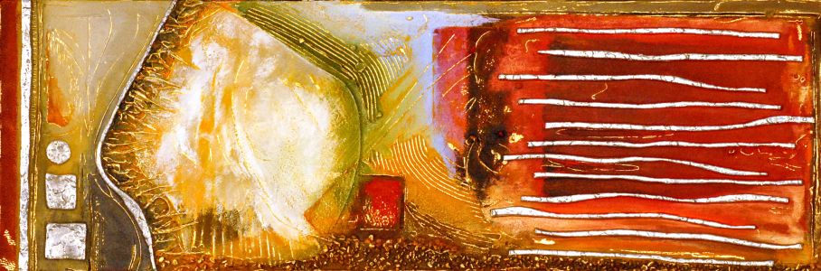 Jedes Bild hat als Grundlage einen verzugsfreien, mehrfach verleimten Holzkeilrahmen, den ich nach meinen Massangaben vom Schreiner anfertigen lasse. Sorgfältig bespanne ich den Keilrahmen mit ausgesuchtem, hochwertigem, ungrundiertem Leinen. Nachdem ich das Leinen mit Hilfe der Keile vorgespannt habe, grundiere ich es mit einer "Gesso-Grundierung". Der Begriff "Gesso" kommt aus dem Italienischen und bedeutet Kreide oder Gips. Die weisse Farbmischung des "Gesso", bestehend aus verschiedenen Bindemitteln, schützt nicht nur die Leinwand, sondern bietet für den späteren Material- und Farbauftrag eine optimale Grundlage. Auf dieser Grundlage entsteht durch das Verarbeiten von handgeschöpftem Papier, Metall, Zinn und anderen strukturgebenden Stoffen eine reliefartige Oberfläche. Ist dieser Arbeitsgang abgeschlossen, beginne ich mit Farbe, dem Bild seinen Ausdruck zu geben. Als Abschluss poliere ich die mit Zinn bedeckten Flächen und schaffe so einen unverwechselbaren Akzent, der im Verlauf der Jahre zu einem wichtigen Erkennungsmerkmal meiner Bilder geworden ist. Das polierte Zinn bringt auf eine magische Weise Licht ins fertige Bild. Diese Besonderheit verhilft dem Werk zu einer Körperlichkeit, die bei wechselndem Tageslicht oder Kunstlicht optisch greifbar bleibt.